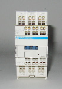 Das Hilfsschütz CAD323FD von Schneider Electric hat eine Steuerkreisspannung von 110 V DC.
